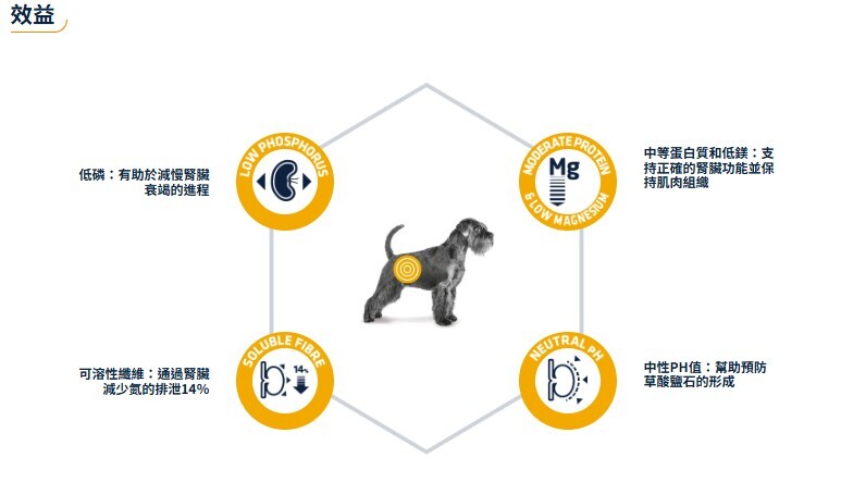 是成年犬的完整飲食產品,蛋白質含量有限,但質量高,磷含量低,特別推薦用於慢性腎臟疾病患者的腎臟功能。