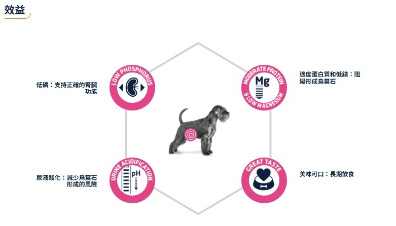 是用於狗的完整飲食產品,具有中等水平的鎂和尿液酸化特性,建議減少尿液中鳥糞石的重現。此外,它的口感極佳,非常適合患有鳥糞石晶體的犬隻日常食用